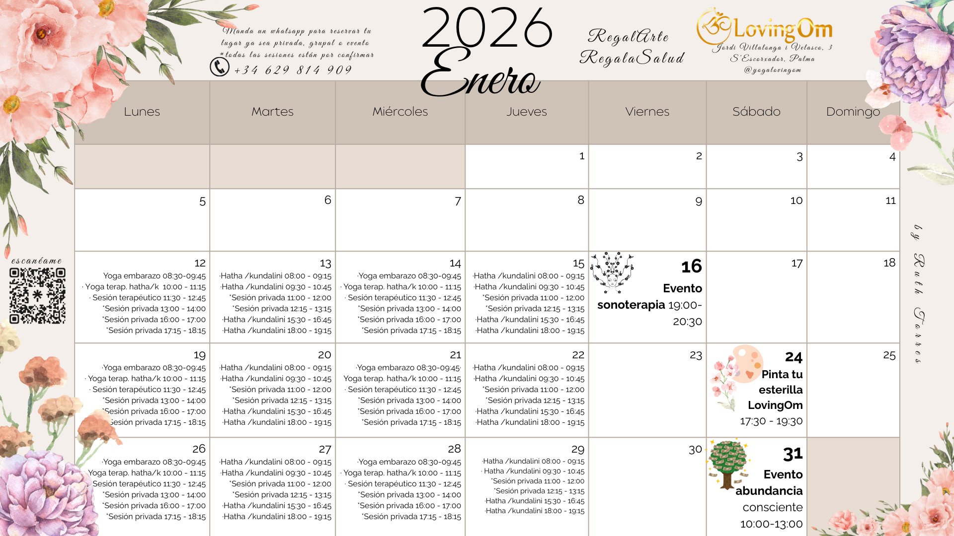 Sesiones de meditación y arte con consciencia plena, Hay sesiones de una hora los martes. Y, uno o dos sábados al mes hacemos una sesión especial con Kundalini yoga y baño de sonidos. La sesión de kundalini es para principiantes, con Kriya suave en silla, relajación con vibración de cuencos… También se están planificando talleres diversos un viernes al mes dedicados a una ceremonia concreta. Spiritualart, yoga facial, saludos al sol... Ceremonia de la feminidad...